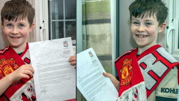 İngiltere Premier Ligi’nde doludizgin yoluna devam eden Liverpool’un bu inanılmaz formunu ardından 10 yaşındaki Manchester United taraftarı Daragh, Kırmızılar’ın hocası Jürgen Klopp’a mektup yazmıştı. Daragh, “Lütfen Liverpool’un sıradaki maçını kaybetmesini sağla” demiş, Alman hoca ise yanıt mektubunda, “Ne yazık ki bu isteğini yerine getiremem” ifadelerini kullanmıştı.