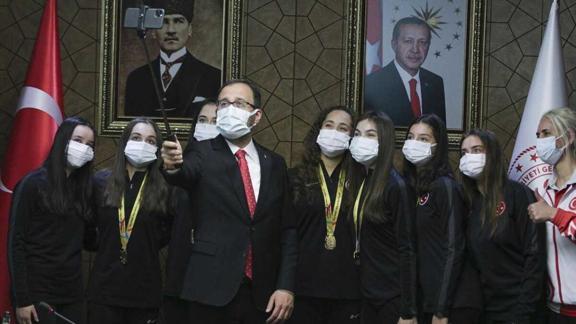 "Bilindiği gibi Avrupa Ritmik Cimnastik Şampiyonası'nda milli takımımız 3 çember 2 labut aletinde Avrupa şampiyonu oldu cumartesi gecesi. Duygu Doğan, Azra Akıncı, Peri Berker, Nil Karabina, Eda Asar takımımızı oluşturan sporcularımız ve finallerde altın madalya kazandılar. Muhteşem bir hikayeyi, muhteşem bir başarıyı yazdılar ve tarihte bir ilki yaşanttılar. Bu sporcular şu an Gençlik ve Spor Bakanlığı'ndalar. Kendi bakanlıklarındalar. Ben her birinizi ayrı ayrı kutluyorum. Sizler bizim iftihar vesilemizsiniz. Tabii ki sizlerin başarısında katkısı olan başta hocalarınız ve her tür özveriden kaçınmayan kıymetli aileleriniz, teknik ekip ve federasyon yönetimini bir aile olarak görüyorum ben. Bu ailede herkesi ayrı ayrı tebrik ediyorum. Sizler bize bir ilki yaşattınız bu alanda ve Türkiye'nin her zaman ifade ediyoruz ya her alanda iddiası olan bir ülke diye, sporcularımızın da her branşta iddiası olduğunu ve bu iddialarında da ne kadar haklı ve başarılı olduğunu ispat ettiniz. Türk gencinin, sporcusunun ve Türk kadınının gücünü gösterdiniz. Bizleri, değerli ailelerinizi ve aziz milleti büyük bir sevince boğdunuz. Her birinize teşekkür ediyorum. Biliyorsunuz pandemi sürecinde şampiyonalar ertelenmişti ve her birimizin evde kalmasını gerektiren bir süreci yaşamıştık. Bize bu süreç hep bir soru olarak geldi; sporcularda bir motivasyon kaybı, bir kondisyon kaybı yaşayacak mı diye. Biz de bilakis bu süreçten çocuklarımız, sporcularımız bir motivasyonla çıkacaklar... Şükürler olsun ki bunu müsabakalar başlayınca gösterir oldular. Pandemi sürecinde bizler iş birliğimizi en yüksek seviyeye çıkardık. Ne gerekiyorsa destek, imkanların nasıl seferber edilmesi gerekiyorsa o, iletişim noktasında 7/24 iletişim ne gerekiyorsa sizlerin yanında olduk, siz de bunu çok güzel bir şekilde değerlendirdiniz. Disiplininizden, inancınızdan azminizden asla taviz vermediniz. Tabii ki aynı zamanda birbirinizle olan iletişiminizle bizlerle koordinasyonunuz da devam etti. Sizler bu aziz milletin hem bugünüsünüz hem yarını. Bizler de bakanlığımız olarak tüm imkanlarımızla sizlerin yanında olmaya devam edeceğiz."