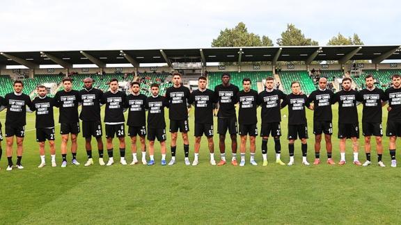 İsrail'in ablukası altında olan Gazze'ye karşı işlenen suçlara tepki gösteren siyah-beyazlılar, önünde "İnsanlığa karşı işlenen suçları durdurun", arkasında ise "Yeter Artık" yazılı siyah tişörtlerle ısınırken tribünlerden de alkış aldı.