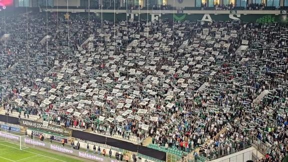 UEFA ve FIFA'ya İsrail takımlarının futboldan men edilmesi çağrısında bulunan yeşil-beyazlı taraftarların yer aldığı tribünde "Kick Israel out of football" (İsrail'i futboldan atın) yazılı pankart açıldı.