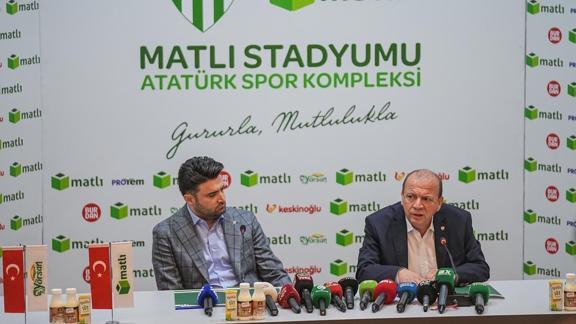 "Çok önemli bir anlaşmaya imza atacak olmanın mutluluğunu yaşıyoruz. Stadyumumuzun isminin bugünden itibaren 1,5 yıllığına 40 milyon lira bedelle Atatürk Spor Kompleksi Matlı Stadyumu olması hususunda anlaşmaya varılmıştır. Yeni bir hikaye yazmaya başladığımız Süper Lig yürüyüşünde tarih Bursaspor'a destek olan kişi kurum ve kuruluşları asla unutmayacaktır. Bununla birlikte bu yürüyüşün hedefine ulaştığı gün süreçte destek olmaktan imtina edenler de tarafımızca muhakkak hatırlanacaktır. "
