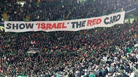İskoçya ekibi Celtic'in taraftarları, takımlarının UEFA Şampiyonlar Ligi'nde Almanya'da Bayern Münih'e konuk olduğu maçta İsrail'in Filistin'e yönelik saldırılarına yine tepki gösterdi.