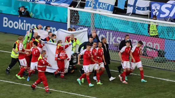 Eriksen, takım arkadaşının sol kanattan taç atışını kullandığı 42. dakikada kendisini yere bıraktı. Olay sonrası sahaya giren sağlık ekipleri, 29 yaşındaki futbolcuya kalp masajı yaptı.
