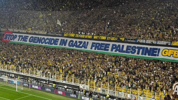 UEFA Şampiyonlar Ligi play-off turu ilk maçında temsilcimiz Fenerbahçe, Portekiz'in Benfica ekibini konuk etti. Sarı lacivertli tribünler, Filistin'e destek pankartı açtı.