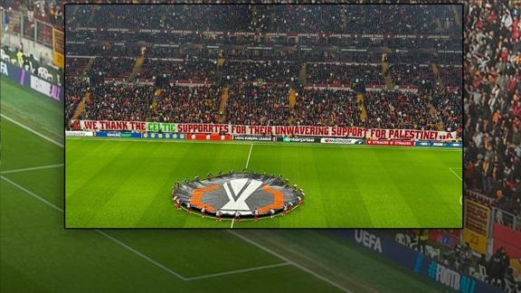 Galatasaray tribünlerinden açılan pankartta, "Celtic taraftarlarına, Filistin'e olan sarsılmaz destekleri için teşekkür ederiz" ifadeleri yer aldı.