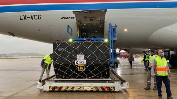 Saat 15.50'de havalimanına inen Cargolux Airlines İnternational şirketine ait Boeing 747 8F tipi kargo uçağındaki araç ve ekipmanlar, çok sayıda personel tarafından tırlara taşındı.