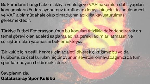 Bu kararların hangi hakem aklıyla verildiği ve VAR hakemleri dahil yapılan konuşmaların Federasyonumuz tarafından detaylı bir şekilde incelenmesi ve VAR'a bir müdahale olup olmadığının açıklığa kavuşturulması gerekmektedir.