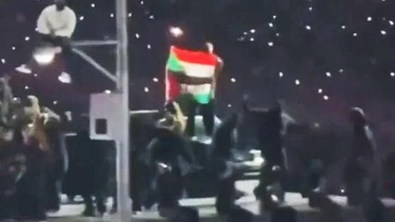 ABD'de milyonların izlediği Amerikan Futbolu Ligi'nin (NFL) şampiyonluk mücadelesi "Süper Bowl" karşılaşmasının devre arasındaki gösteride dansçıların arasına giren bir kişi, elinde Sudan ve Filistin bayrağı ile İsrail'in Gazze'ye saldırılarını protesto etti.