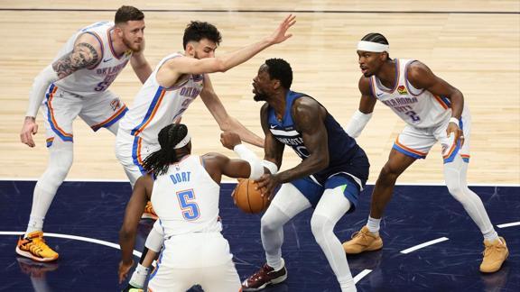 Amerikan Basketbol Ligi (NBA) Batı Konferansı finalinde Oklahoma City Thunder'ı 143-101 yenen Minnesota Timberwolves geride olduğu seride durumu 2-1'e getirdi.