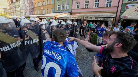Polonya'nın Wroclaw kentindeki final müsabakası için şehire gelen İngiliz ve İspanyol taraftarlar, UEFA etkinliklerinin yapıldığı Market Square'da karşı karşıya geldi.
