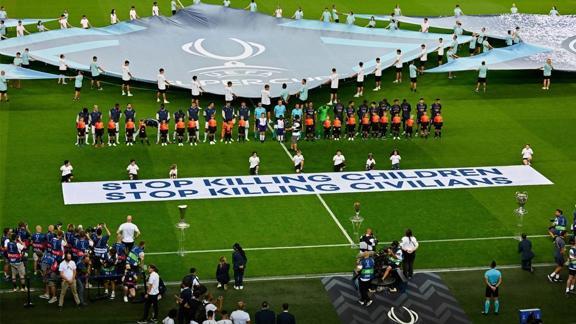 Süper Kupa maç önü seremonisinde açılan pankartta, ''Çocukları ve sivilleri öldürmeyi durdurun'' ifadeleri yer aldı.
