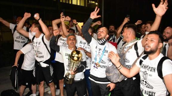 İstanbul'daki Atatürk Olimpiyat Stadı'nda oynanan play-off final maçında başka bir İzmir takımı olan Altınordu'yu 1-0 yenerek Süper Lig'e çıkan Altay takımı kafilesi taşıyan uçak, gece saatlerinde İzmir Adnan Menderes Havalimanı'na indi.