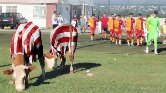 Ümraniyespor'un Galatasaray'ı konuk ettiği müsabaka öncesinde büyükbaş hayvanların bölgede otladığı sırada çekilen fotoğraf, sosyal medyada geniş yer buldu.