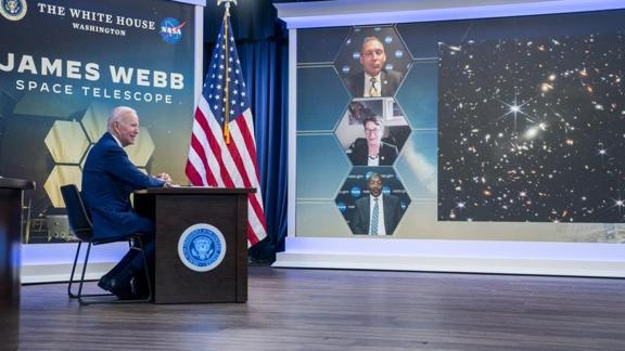 Beyaz Saray'da düzenlenen törende NASA yetkilileri, Biden'a teleskopun çektiği ilk fotoğraf hakkında bilgi verdi.