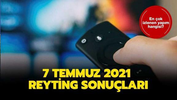 7 Temmuz 2021 çarşamba gününün reyting sonuçları bugün saat 10:00'da açıklandı. TRT 1'de yayınlanan UEFA EURO 2020 karşılaşması birinci oldu. İkinci sırada ise Sen Çal Kapımı dizisi yer aldı.