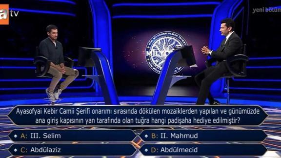 Kim Milyoner Olmak İster'de "Ayasofya'nın mozaiklerinden yapılan tuğra hangi padişaha hediye edilmiştir?" sorusuyla yarışmacıyı zorladı. Kenan İmirzalıoğlu'nun sunumuyla ekrana gelen 13 Haziran 2021 tarihli Kim Milyoner Olmak İster'de yöneltilen soruların cevapları haberimizde.