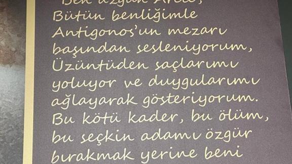 "Ben üzgün Arete, bütün benliğimle Antigonos'un mezarı başından sesleniyorum. Üzüntüden saçlarımı yoluyor ve duygularımı ağlayarak gösteriyorum. Bu kötü talih, bu ölüm bu seçkin adamı özgür bırakmak yerine beni tutsak etti."