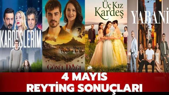 4 Mayıs reyting sonuçları açıklandı. Bu akşam ekrana Kardeşlerim ve Gönül Dağı yeni bölümü ile ekrana gelirken, Üç Kız Kardeş ise final bölümü ile izleyicisinin karşısına son kez çıkıyor. Yabani dizisi de yeni gününde ilk kez Cumartesi günü ekranlarda olacak. Peki, reyting listesi nasıl bir hal aldı? İşte 4 Mayıs reyting sonuçları