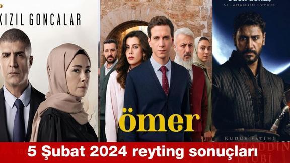 5 Şubat reyting sonuçları merak ediliyor. Dün akşam Fox TV'de Kızıl Goncalar, Star TV'de Ömer, ATV'de Safir, TRT1'de Selahaddin Eyyubi isimli dizileri yeni bölümleriyle izleyici karşısına çıkarken, Kanal D'de İnci Taneleri, Show TV'de Hababam Sınıfı Uyanıyor isimli yerli sinema filmi ekrana geldi. İzleyiciler hangi yapımın birinci olacağını araştırıyor.