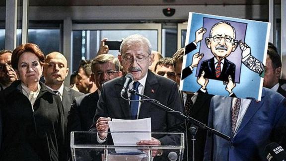 Kemal Kılıçdaroğlu'nun adaylığını manşete taşıyan Cumhuriyet Gazetesi'nin ilk sayfasında yayınlanan karikatürde, Akşener'in Kemal Kılıçdaroğlu'nun fotoğrafını "kırık el" ile tuttuğu ve bu elin üzerinde de Ekrem İmamoğlu ile Mansur Yavaş'ın fotoğrafları olduğu görüldü.