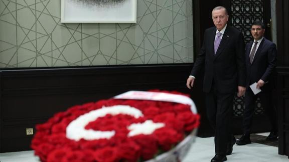Toplantıda MHP lideri Devlet Bahçeli'nin Başkan Erdoğan'a gönderdiği ay yıldızlı çelenk dikkat çekti.