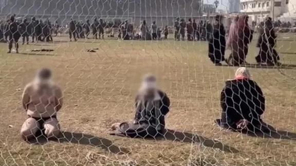 Bir başka görüntünde ise alıkonulan yüzlerce sivilin götürüldüğü stadyumun, Gazze'deki Yarmuk Stadı olduğu tespit edildi. Vahşet görüntülerinde iç çamaşırları kalana kadar soyulmuş, gözleri bağlanmış ve yerde diz çökmeye zorlanmış siviller yer alıyor. Öte yandan aralarına kadınların da olduğu bir grubun diz çöktürüldüğü kalenin üstüne İsrail bayrağının asılmış olduğu anlar yer alıyor.