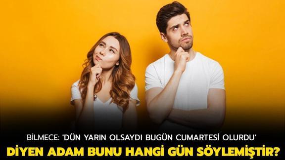 Bilmeceler, hem eğlenmeyi hem de beyin egzersizi yapmaya olanak tanırken, aileniz ve arkadaşlarınızla da güzel vakit geçirmenizi sağlar. 'Dün yarın olsaydı bugün cumartesi olurdu' diyen adam bunu hangi gün söylemiştir? bilmecesi, sosyal medyada trend oldu. Peki 'Dün yarın olsaydı bugün cumartesi olurdu' diyen adam bunu hangi gün söylemiştir? İşte cevabı