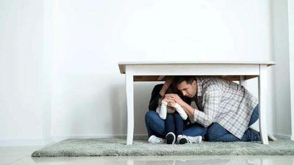 Anonsla birlikte ilk olarak çöküp sağlam bir nesnenin altına girilmeli veya yanına geçilmeli. Pencere yakınındaysanız sırt kısmınız pencereye dönük olması lazım. Kapanıp, başınızı ve ensenizi düşen cisimlerden koruyacak şekilde durmalısınız. Sarsıntı sona erene kadar, sallanan nesneyle beraber hareket edebilmek için nesneye tutunmanız ve nesneyi tutarken de kollarınızı yüzünüze koymanız gerekmektedir. Çünkü afet esnasında uçuşan cisimlerden yüzünüzü ve gözünüzü böylece koruyabilirsiniz.