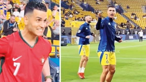 Maç öncesi ısınmaya çıkan Cristiano Ronaldo, tribündeki Akdoğan'a "Sen bana benzemiyorsun, çok çirkinsin" ifadeleriyle 'Adanalı Ronaldo' lakaplı Türk fenomen Gökmen Akdoğan'la şakalaştı.