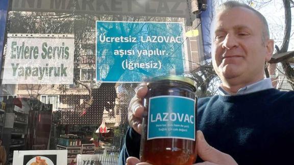 DHA'da yer alan habere göre, Kadıköy Feneryolu Mahallesi'nde 'Laz bakkal' olarak tanınan Fatih Bostan dükkanının önündeki ağaca 2 adet karakovan koymuştu. Geçtiğimiz ekim ayında da kovanların ilk hasadını mahalleli ile paylaşmıştı. Bostan bu kez de bakkalında bulunan 3 ayrı balı birleştirerek iğnesiz koronavirüs aşısı olarak tabir ettiği Lazovac'ı oluşturdu. Lazovac'ı duyan mahalle sakinleri de bakkala giderek iğnesiz aşıyı tatmak için sıraya girdi.