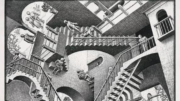 Aşağıdaki görüntü yer çekimi yasalarının geçerli olmadığı bir dünyayı bize sunuyor. M.C. Escher tarafından yapılan bu resim günlük rutin işlerini yürüten bir topluluğun sakinlerini gösteriyor. Bu illüzyonda sizden beklenen şey merdivenlerin hangi yöne gittiğini tespit etmeniz olacaktır. Ancak hemen belirtelim ki, bu testi çözen çoğu insan merdivenin olduğu yönü bulmaya çalışırken kafası karıştı.