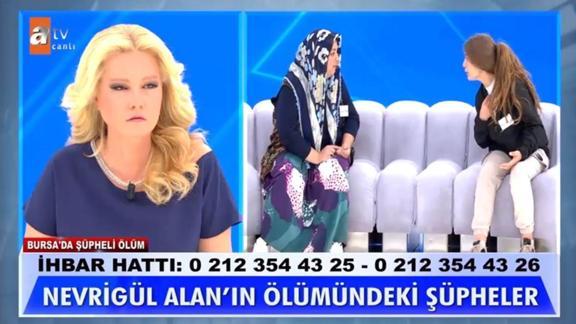 Müge Anlı'da Nevrigül Alan olayında Nazmiye'nin neler anlattığı merak ediliyor. Atv ekranında hafta içi hergün yayınlanan Müge Anlı ile Tatlı Sert'te intihar süsü verilmiş cinayet olayı işleniyor. Kaybından 40 gün sonra 18 Ekim'de bir ağaca asılı halde bulunan Nevrigül Alan'ın cinayeti ile ilgili olarak kardeşi Nazmiye, Müge Anlı'ya özel olarak odada bildiği herşeyi anlatacağını söylemişti. Müge Anlı'da Nevrigül Alan olayında Nazmiye ne anlattı?