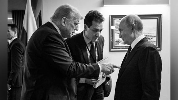 Parmağıyla Rus lider Putin'in göğsüne dokunan Trump, 1959 yılında meşhur "Mutfak Tartışması" olarak bilinen SSCB lideri Kruşçev ile ABD Başkan yardımcısı Nixon'ın fotoğrafına atıfta bulundu.