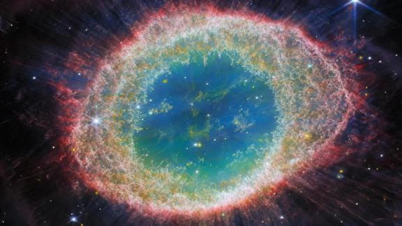 James Webb Uzay Teleskobu (JWST), Halka Bulutsusu'nun bugün yayınlanan olağanüstü ayrıntılı görüntülerini yakaladı. M57 ve NGC 6720 olarak da adlandırılan gaz bulutu, moleküler hidrojen bakımından zengin 20.000 yoğun kürecik içeriyor. Dünya'dan yaklaşık 2,500 ışık yılı uzaklıkta yer almaktadır.