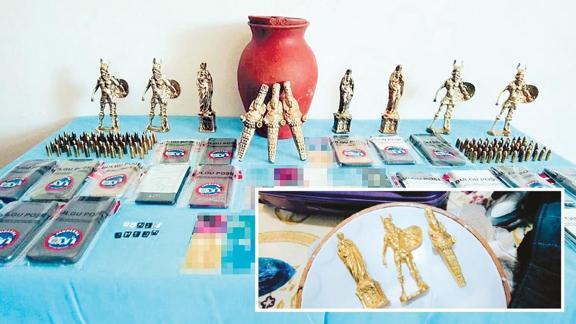 Dolandırıcıların adreslerindeki aramalarında, çok sayıda heykel, küp, sim kart, yüklü miktarda para ve silah ele geçirildi.