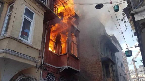 Beyoğlu'nda 2 katlı binanın 2. katında yangın çıktı. Daire alev alev yanarken, ekipler yangına müdahale ediyor.