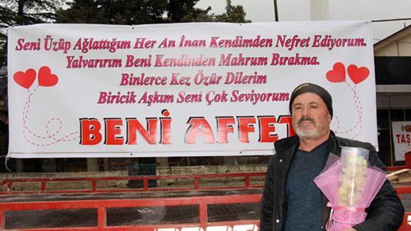 Mustafa Erdoğan, barışmak için girişimlerde bulunmaya devam etti. Bugün de 2 çocuk babası Mustafa Erdoğan, 14 Şubat Sevgililer Günü dolayısıyla eşiyle barışmak için Fatma Hanım Erdoğan'ın Oğuzhan Ahmet Yesevi Caddesi'nde bulunan bijuteri dükkanının önüne çekiciye astığı bir pankartla geldi. Çekicide asılı 'Seni üzüp ağlattım, her an inan kendimden nefret ediyorum. Yalvarırım beni kendinden mahrum bırakma. Binlerce kez özür dilerim. Biricik aşkım seni çok seviyorum. Beni affet' yazılı pankartı dükkanın önüne park eden Mustafa Erdoğan, eline bir buket çiçek alıp, Fatma Hanım Erdoğan'dan dışarı çıkmasını istedi.