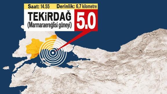 Marmara bir kez daha sallandı. Dün saat 14.55'te Tekirdağ Marmaraereğlisi'nin 18 km açığında 5 büyüklüğünde deprem meydana geldi. 15 saniyelik sarsıntı başta İstanbul olmak üzere Bursa ve Yalova'da da hissedildi. 17.27'de de 4,0 büyüklüğünde artçı gerçekleşti.