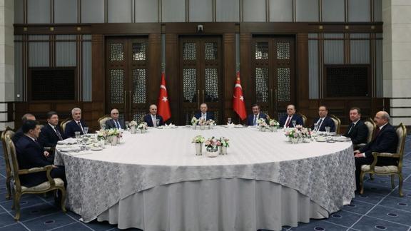 Başkan Recep Tayyip Erdoğan, Cumhurbaşkanlığı Külliyesi'nde yüksek yargı organı temsilcileri için akşam yemeği verdi. TBMM Başkanı Numan Kurtulmuş, Cumhurbaşkanı Yardımcısı Cevdet Yılmaz, Adalet Bakanı Yılmaz Tunç'un da yer aldığı akşam yemeği basına kapalı gerçekleştirildi. Yemeğe yüksek yargı organlarından katılanlar şu isimlerden oluştu; Anayasa Mahkemesi Başkanı Kadir Özkaya, Yargıtay Başkanı Ömer Kerkez, Sayıştay Başkanı Metin Yener, Danıştay Başkanı Zeki Yiğit, Uyuşmazlık Mahkemesi Başkanı Rıdvan Güleç ve Cumhurbaşkanlığı Devlet Denetleme Kurulu Başkanı Salih Tanrıkulu.