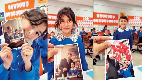 Bu anlara ait video sosyal medyada paylaşıldı. Karelerde öğrenciler, Atatürk'le bayrak tutuyor, tarihi bir arka plan önünde birlikte poz vermiş görünüyor.