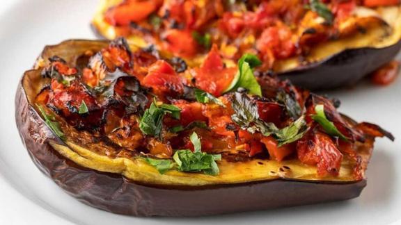 İç malzemesi için tavaya aldığınız zeytinyağı ile soğanları ve sarımsakları soteleyin. Kabukları soyulmuş ve küp küp doğranmış domatesleri ve kıyılmış biberleri katın. Domates suyunu salıp çekene kadar sotelemeye devam edin. Toz şeker ve tuzunu katın. Hazırladığınız iç harcı patlıcanların ortasına yerleştirin. Önceden ısıttığınız 180 derece fırında 15-20 dakika pişirin. İsteğe bağlı üzerini maydanozla süsleyip servis edebilirsiniz. Afiyet olsun…