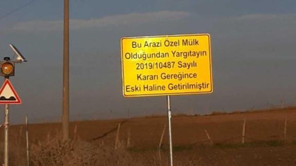 Sökülen yola, "Bu arazi özel mülk olduğundan Yargıtay'ın 2019/10487 kararı ile arazi sahibinin hak kazandığı bölümdeki asfalt kazılarak yok eski haline getirilmiştir" yazılı tabela konuldu.