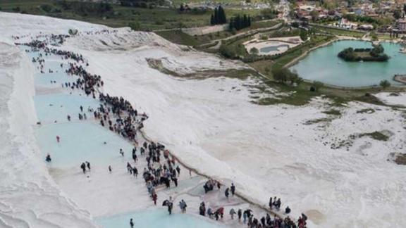 Turizm Haftası nedeniyle girişlerin ücretsiz olduğu UNESCO Dünya Mirası Listesi'nde yer alan Pamukkale ören yerinde ziyaretçi yoğunluğu yaşandı. Saat 15:00 ile 18:00 arası giriş ücreti alınmayan Pamukkale'yi yaklaşık 15 bin kişi ziyaret etti.