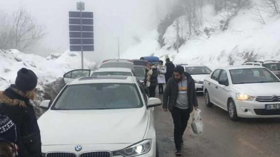 Kayak merkezinin otoparkı tamamen dolunca zirve yolunda yaklaşık 3 kilometrelik araç kuyruğu oluştu.