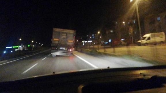 Bursa istikametinden Ankara istikametine seyir halinde olan kamyonun arka sağ tarafında bulunan iki lastiği Ümitalan mevkiinde büyük bir gürültü ile patladı. Yaklaşık 10 kilometre arka sağ lastiklerinin ikisi de patlak şekilde neredeyse jantları üzerinde ilerleyen kamyon, trafikteki araçları da büyük riske attı. Lastik parçaları sağa sola savrulurken, bu görüntüler yolda seyahat eden diğer sürücüler tarafından cep telefonu ile kaydedildi. İnegöl girişinde polisler tarafından durdurulan kamyonet parka çekilirken, şoför hakkında işlem yapıldığı bildirildi.