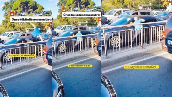 Saldırgan İETT şoförü, bir süre sonra tükürüp demir güvenlik bariyerlerinden atlayarak sürücüyü yumrukladı.