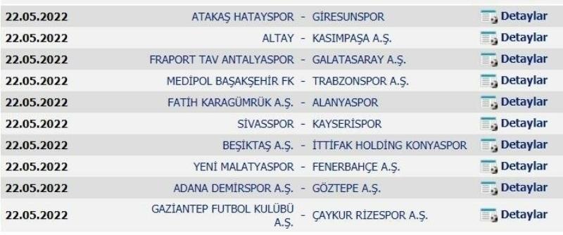Süper Lig'de 2021-2022 sezonu fikstürü, Türkiye Futbol Federasyonunu Riva'daki idari merkezinde yapılan kura çekimi ile belirlendi. Ligde yeni sezon 13 Ağustos'ta başlayacak ve 27 Aralık'ta ilk yarı sona erecek. 7 Ocak'ta ikinci yarısı başlayacak Süper Lig, 22 Mayıs'ta tamamlanacak. İşte Süper Lig'in 38 haftalık programı...