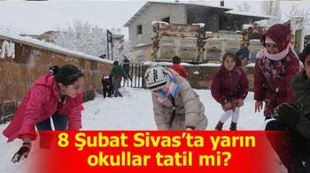 <meta name="description" content="8 Şubat Cuma Sivas’ta yarın okullar tatil mi&quot; Sivas kar tatili haberleri Valilik MEB açıklaması ilde yaşayan öğrenciler ve velilerin merak konusu oldu. Ülke genelinde etkili olan yoğun kar yağışı, buzlanma ve soğuk hava hayatı olumsuz yönde etkiliyor.  Meteoroloji Genel Müdürlüğü tarafından yapılan son değerlendirmelere göre; Ülkemiz genelinin parçalı ve çok bulutlu, Kıyı Ege haricinde tüm yurdun yağışlı geçeceği tahmin ediliyor." />