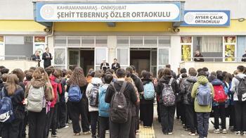 <meta name="description" content="Kahramanmaraş'ta silahlı saldırının gerçekleştirildiği Ayser Çalık Ortaokulu öğrencileri, yerleştirildikleri okulda acı olayda hayatını kaybeden öğretmen ve arkadaşlarını anarak ders başı yaptı." />